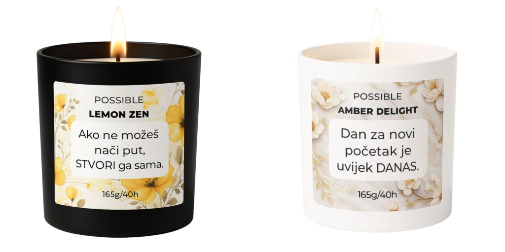 Ručno rađene mirisne svijeće POSSIBLE nisu samo obične svijeće – one su poziv na trenutak za sebe. Svaka svijeća u sebi skriva jedinstvenu kombinaciju mirisa i poruka koje te podsjećaju da je snaga uvijek u tvojim rukama. Upali je, udahni njen miris i osjeti kako se prostor ispunjava smirenošću, ljepotom i novim poletom.